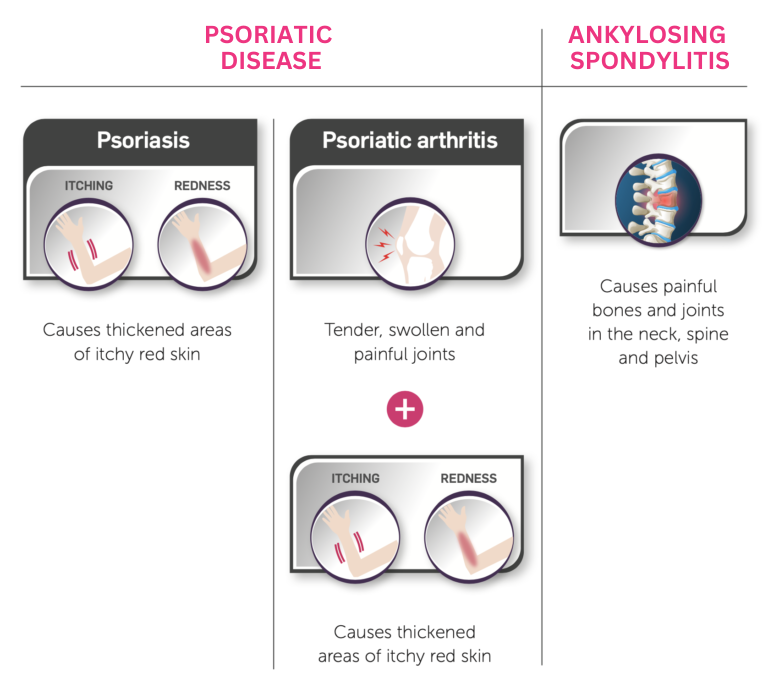In autoimmune diseases – like psoriatic disease, ankylosing spondylitis and non-radiographic axial spondyloarthritis – the immune system mistakenly attacks the body’s own healthy tissues, triggering an increase in inflammation.